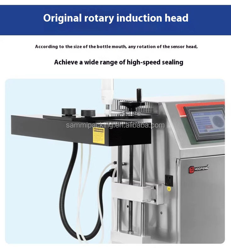 유리 병 또는 플라스틱 병에 평면 둥근 나사 뚜?? 을 밀폐하기에 적합합니다. 이 인덕션 밀폐 기계는 금속 컨테이너에 적합하지 않습니다.선택적으로 20mm-180mm 사이입니다큰 생산 공장에 적합합니다.